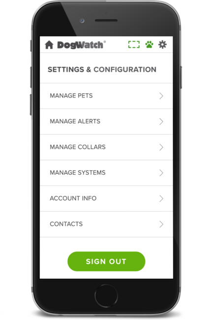 Review your system settings anytime, anywhere. The DogWatch SmartFence App displays your DogWatch SmartCollar®’s training level and the Transmitter’s training mode, rate, frequency and range.